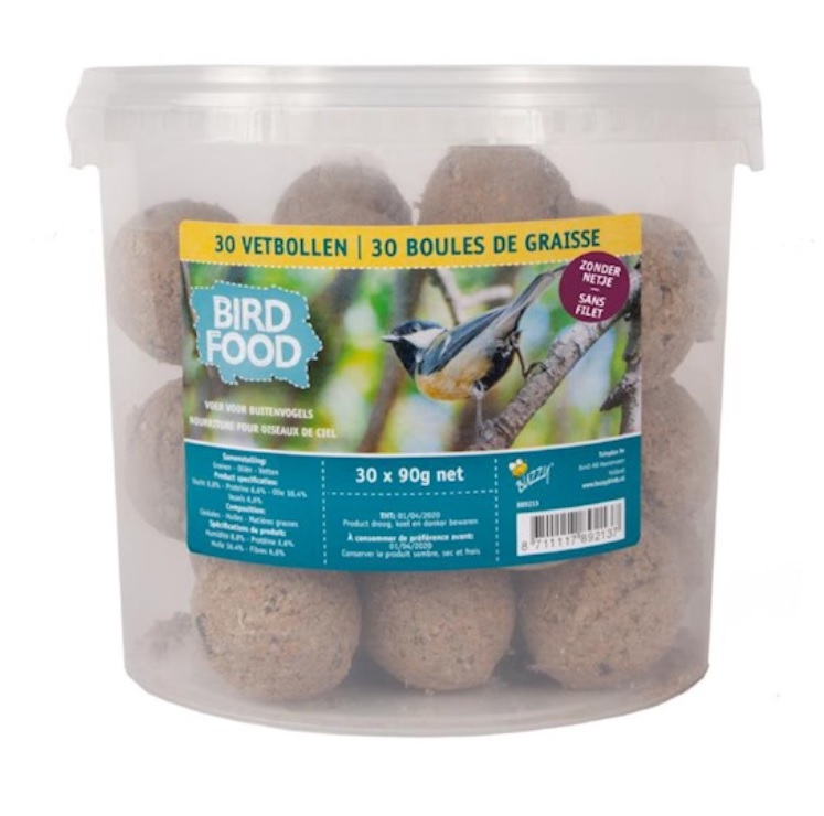 30 Stück pro Eimer. Diese Fettkugeln von Bird werden aus hochwertigen Zutaten aus Nierenfett mit einer Mischung aus Getreide und Samen hergestellt. Getreide und Samen sind reich an Ballaststoffen, Proteinen und Vitamin B, und die Fettkugeln enthalten außerdem Vitamin E und Mineralien. Ohne Netz!
